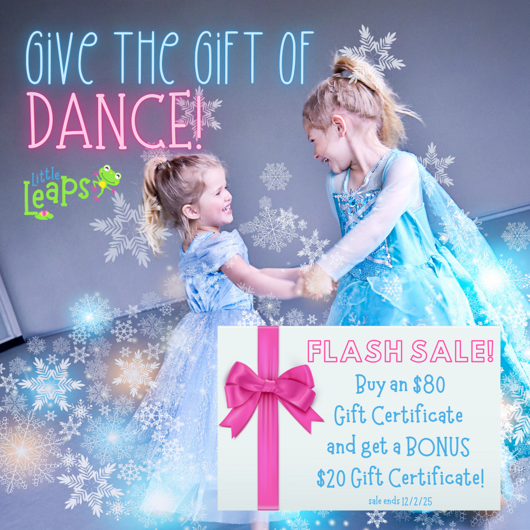 For a limited time only, buy an $80 Little Leaps gift certificate and receive a BONUS $20. That’s $100 in value to use toward classes, camps, dancewear, dance shoes, and MORE!